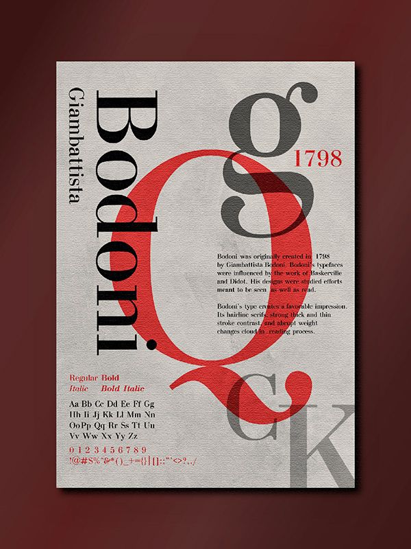 Las tipografías sans Serif se catalogan por ser limpias y sin remates, como ésta con la que lees el artículo. Sin embargo las que son con serifa (o tradicionalmente llamadas romanas) tienen los remates y suelen asociarse con tipografías clásicas o como su nombre indica con tipografías de aspecto romano. Como la Bodoni en la imagen de abajo.